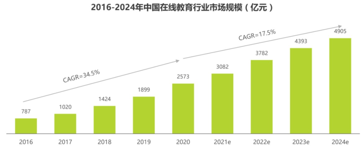 这个乘着疫情东风起飞的行业,截止2020年10月,2020年新增的教育类相关企业47.6万家,同比净增22.5%。据艾瑞咨询数据,在线教育市场规模将于2021年达到3082亿元,年复合平均增速为17.5%。