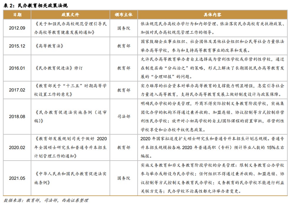5月教育部发布修订后的《中华人民共和国民办教育促进法实施条例》将自2021年9月1日起施行。职业教育法修订草案也已提请全国人大常委会审议,指出“职业教育与普通教育具有同等重要地位”。