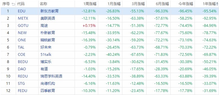 在股价层面,今年以来截至7月12日午盘,在线教育三巨头新东方、好未来、高途集团的跌幅分别达-95.54%、-72.22%、-84.96%,港股的思考乐教育、新东方在线和卓越教育也分别跌去81.66%、76.25%、64.60%。