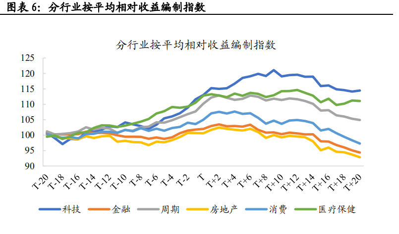 以原材料业和工业为代表的周期行业,以及消费业表现居中,累计相对收益的最高值分别为12%、7%,到T+20个交易日累计平均超额收益回落至4%和-3%。
