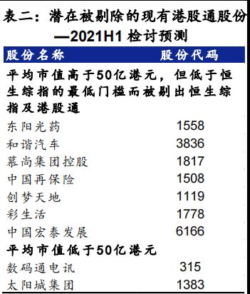 而投资者在关注港股通潜在纳入标的以外,也需要注意潜在被剔除港股通的公司名单,以规避相关风险。
