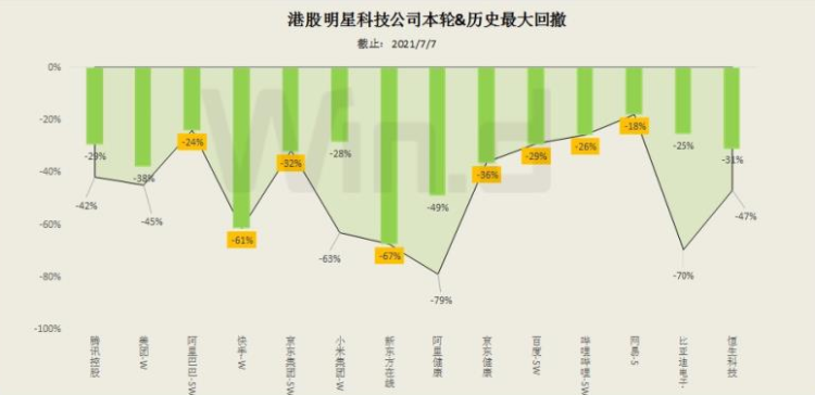 阿里、网易、快手、京东、京东健康、百度、B站都是近两年左右才在港股上市,所以本轮下跌就是他们历史最大回撤幅度。其他几家上市较早的科技公司目前跌幅相对历史最低还有一定幅度。