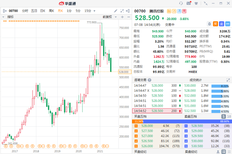 当时下跌的主要有多重负面因素加持。游戏版号停发、微信用户增速放缓、字节跳动崛起,在短视频时长占用增多,而腾讯的短视频业务无大幅进展,还有2018年3月,Naspers第一次减持腾讯。