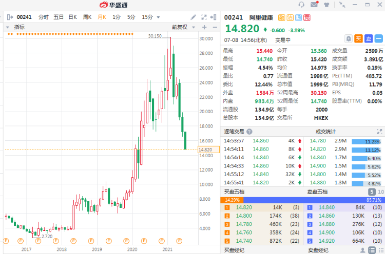 遭到这一重大打击,阿里健康从2015年初开始下跌,一路跌至2016年2月,期间跌幅接近80%。随后整体箱体震荡两年时间,从2018年最低4港币附近开始上涨,最高涨至今年30港币。