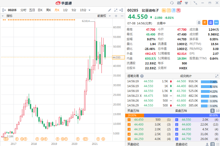 比亚迪电子从2017年中开始下跌至2018年中,随后箱体盘整两年,在2020年初开始发力,从最低10港币附近涨至年初最高63港币。