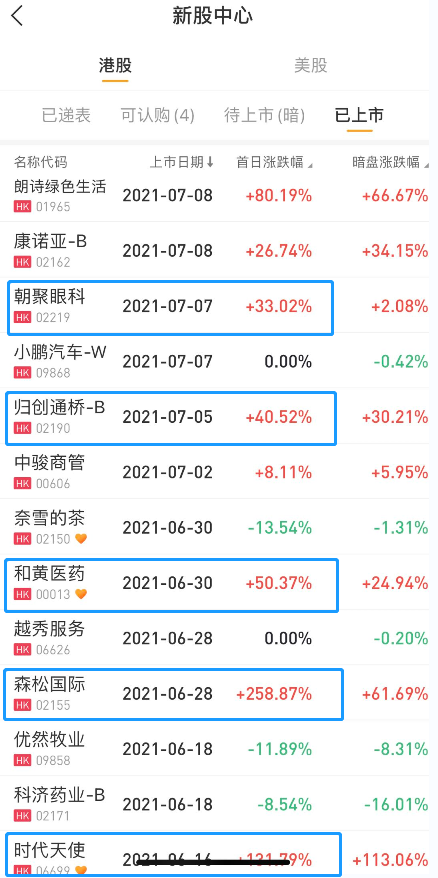 不仅如此,前几天上市的朝聚眼科(02219)、归创通桥-B(02190)、和黄医药(00013)、森松国际(02155)等,上市首日均有大涨超30%的表现,森松国际首日涨幅甚至高达258.87%!
