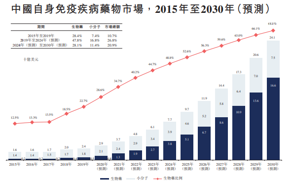 而今日上市的康诺亚则是专注自身免疫疗法和肿瘤药的公司,据弗若斯特沙利文的数据显示,中国自身免疫疾病生物药市场的规模到2030年将达到166亿美元(约合1100亿人民币),前景相较于科济药业明显有更广阔的的空间。