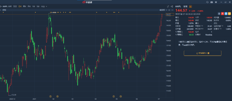 苹果股价周三收于144.57美元,超过了2021年1月创下的收盘纪录高点,但仍低于1月份创下145.09美元的盘中纪录高位。