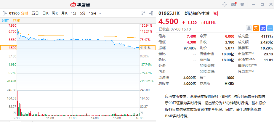 华盛资讯7月8日讯,物管服务商朗诗绿色生活(01965.HK)盘中一度爆涨125%,首挂收涨41.51%,一手账面浮盈1320港币,全日成交额2.42亿港币,最新总市值18亿港币。