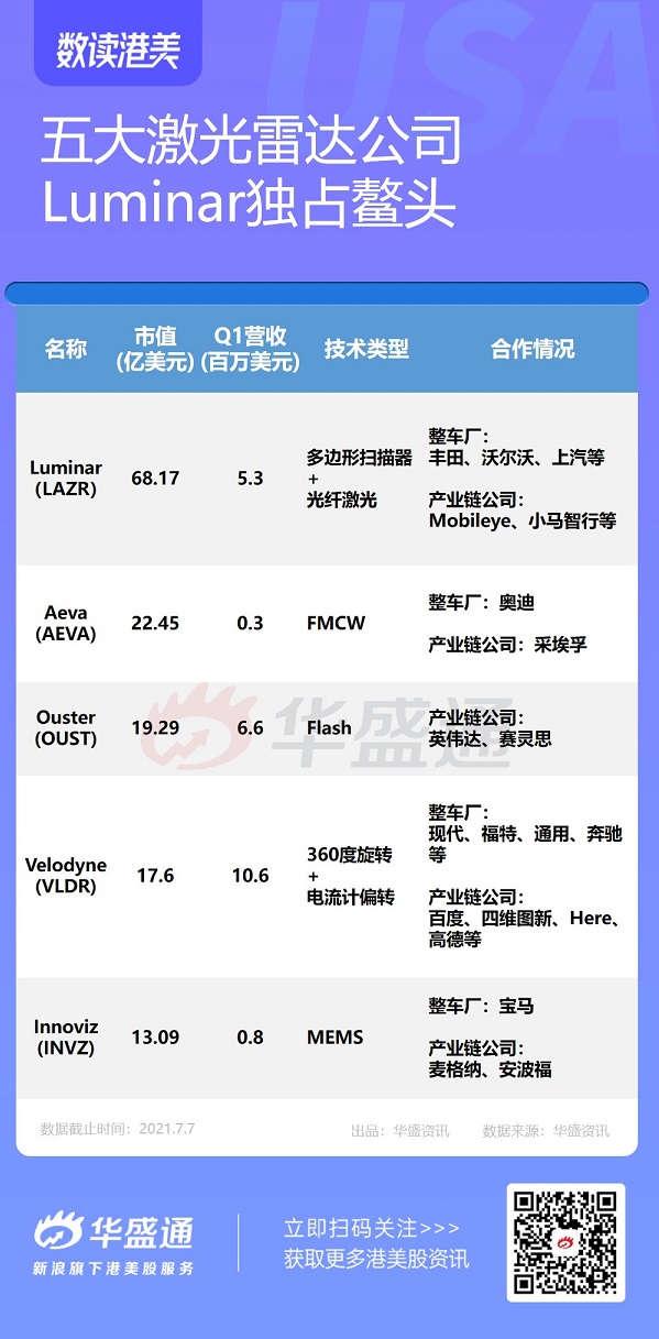 截至7月7日美股收盘,Luminar (LAZR)是目前市值最高的激光雷达公司,市值约为68亿美元。