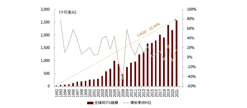 2、规模增速可观,资金持续流入:自1992年以来,全球REITs规模年均增速达16.58%。而美国又以绝对的优势占据全球超过60%的REITs市场。