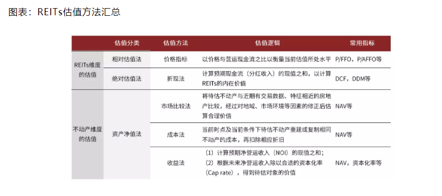 就REITs而言,选择衡量的标准除了行业分类外,一般会通过相对估值法、绝对估值法和资产净值法来确定单只REIT的估值范围(详见下表)。