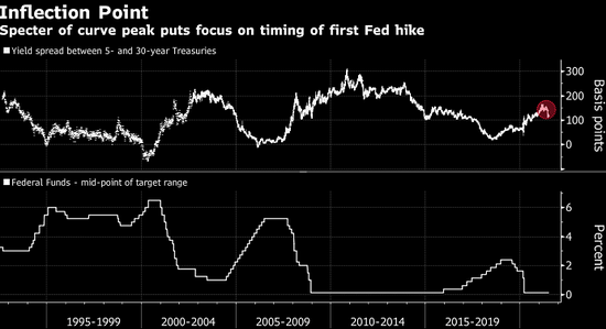 自2月收益率差达到约七年高点以来,这种动态趋势就一直持续。随着经济复苏推动交易员提前了预期加息时点,5年期收益率比2月中旬高出约25个基点。与此同时,长期债券收益率周四跌至2月2日以来最低水平。结果是收益率差接近2021年迄今最窄。