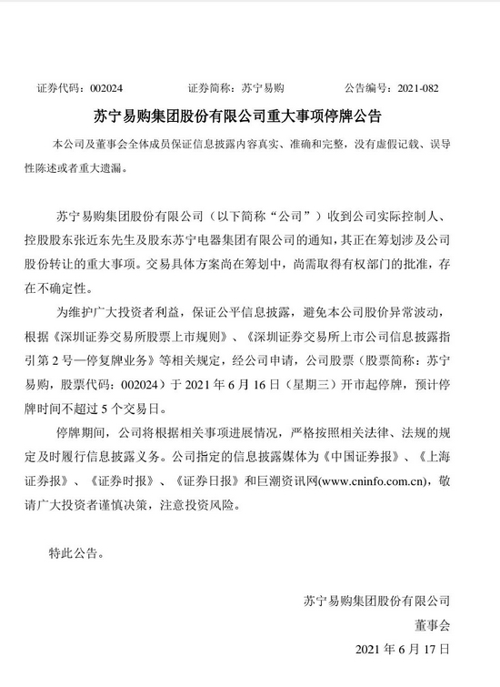 多重冲击之下,苏宁易购的股价直线式下滑,6月16日跌至停牌。