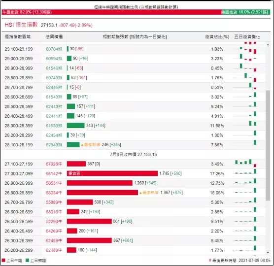 街货分布方面,至周四,恒指牛证街货在收回价26700点至27200点之间,相当约5239张期指合约;恒指熊证街货主要贴价区间在收回价28100点至28600点之间,累计相当约930张期指合约。