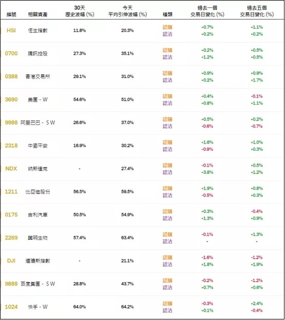 周四恒指相关权证的平均引伸波幅报约20.3%,按日上调0.7个百分点。个股方面,中国平安、比迪相关认购证的引申波幅上调超1%,腾讯、吉利、纳斯达克相关认沽证的引申波幅上调超1%。