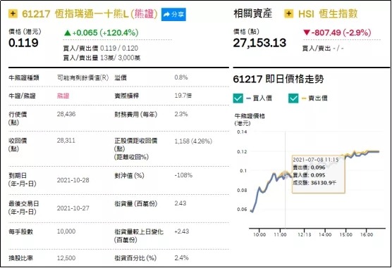 1、强势轮证:恒指瑞通一十熊(61217.HK),周四大涨120.4%;