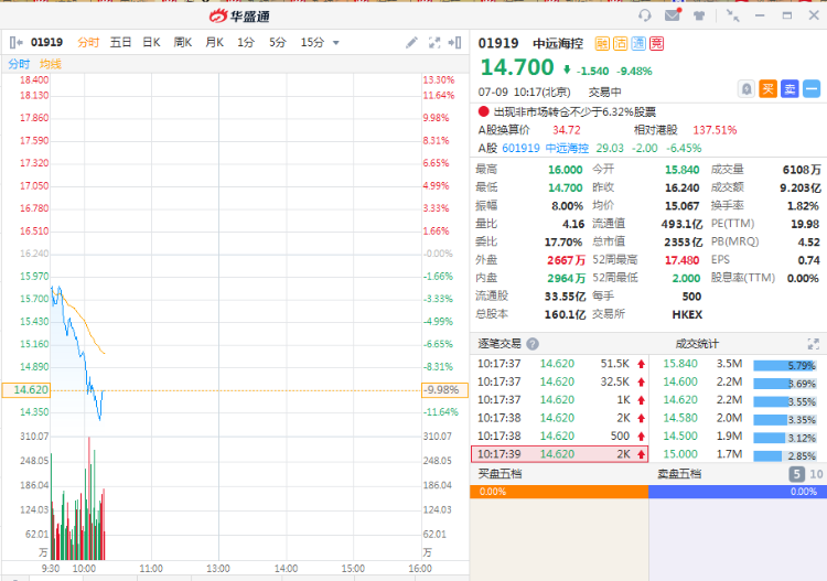 中远海控绩后连续大跌,目前在香港暴跌9%,A股跌6%,7月7日晚,中远海控发布2021年半年度业绩预告,公司预计,今年上半年,其实现归属于上市公司股东的净利润(简称净利润)约为370.93亿元。以此估算,日均盈利逾2亿元。2020年上半年,公司实现净利润11.37亿元,今年上半年的净利润较去年同期增长超过30倍。