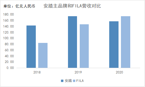 从财务数据上看,无论是营收还是毛利率,FILA对公司的贡献都远高于安踏主品牌。2020年,FILA实现收入174.5亿元,占比高达49.1%,撑起了安踏总营收的半壁江山;而同期,安踏主品牌的收入占比则为44.3%。