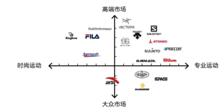 根据公司旗下品牌矩阵图,不难看出安踏的野心与布局。目前,安踏旗下品牌通过纵向覆盖大众市场和高端市场,横向细分为时尚运动品牌和以滑雪、户外、球类、自行车为代表的专业运动品牌,形成了全市场、多品类、多品牌的交叉覆盖。