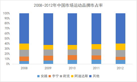 这一年,在奥林匹克精神的带动下,全民运动的热情空前高涨,对运动鞋服的需求急剧攀升,国产运动品牌迎来巨大的红利期。在需求带动下,李宁、安踏等国产品牌的市占率开始稳步提升,与耐克、阿迪达斯之间的差距不断缩小。根据Euromonitor数据,2008年-2010年,李宁在中国市场的市占率分别为9%、9.8%和9.6%;同期安踏的市占率也达到了5.8%、6.9%和8.1%。