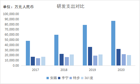 近年来,安踏几乎已成为国内研发投入最多的运动品牌。以2020年为例,安踏的研发支出高达8.71亿元,同期李宁的研发支出为3.23亿元,特步和361度则为2.23亿元、2.05亿元。