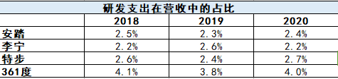 与此同时,安踏每年的研发投入金额虽然在国内运动品牌中居首,但其研发支出在总收入中的占比却并不算高。如图,2020年,安踏的研发支出占比为2.4%,同期361度则为4%。这意味着,安踏资金相对充裕,在不影响利润的基础上,仍然有较大的研发投入空间。