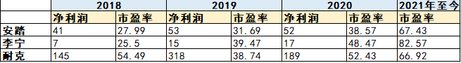 然而,从当前估值来看,对比耐克,以安踏为代表的部分国产运动品牌大概率存在市值被高估的风险。根据下表所示,2020年安踏净利润为52亿元,耐克(2019年12月至2020年11月)净利润为189亿元,在利润规模不及耐克三分之一的情况下,安踏2021年至今的平均市盈率(67.43倍)却与耐克(66.92倍)相差无几。