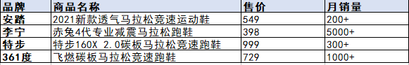 以马拉松竞速跑鞋为例,如图所示,在四家品牌的同类型产品中,安踏马拉松竞速跑鞋性价比较高,但销量却是最少的,这或许在一定程度上说明,安踏主品牌产品在消费者体验及口碑方面仍有较大的提升空间。