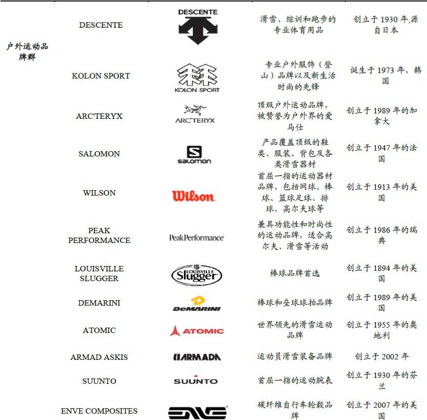 专业运动品牌包括主品牌安踏、安踏儿童、Sprandi;时尚运动品牌包括FILA、FILA Fusion、FILA Kids、KINGKOW等;户外运动品牌则包括迪桑特、可隆,以及Amer旗下始祖鸟、萨洛蒙等。