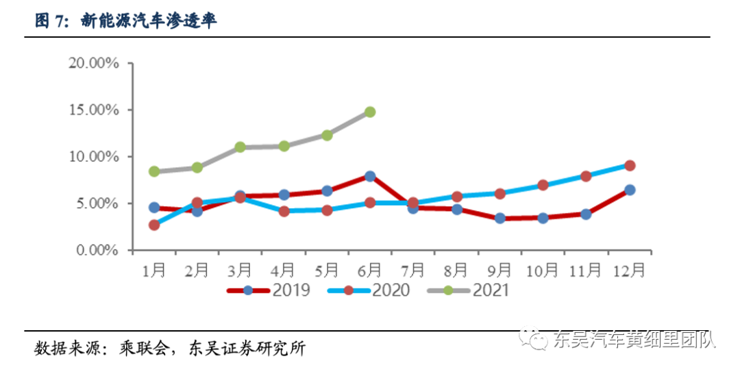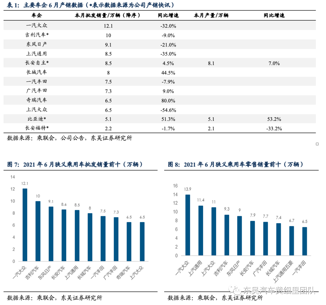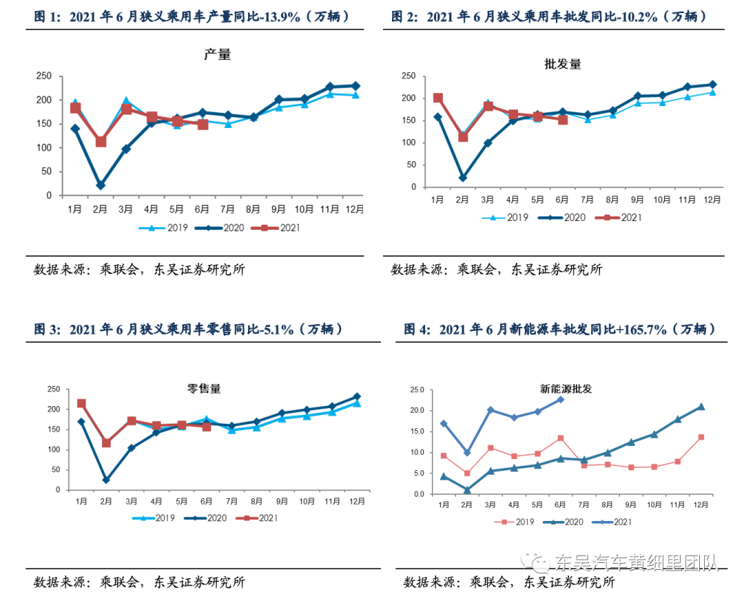 芯片短缺+同比基数影响下,6月行业整体产批表现略低于我们的预期(5月月报预期6月同比-5%~0%),新能源产批超预期(5月月报预期批发20万辆左右)。