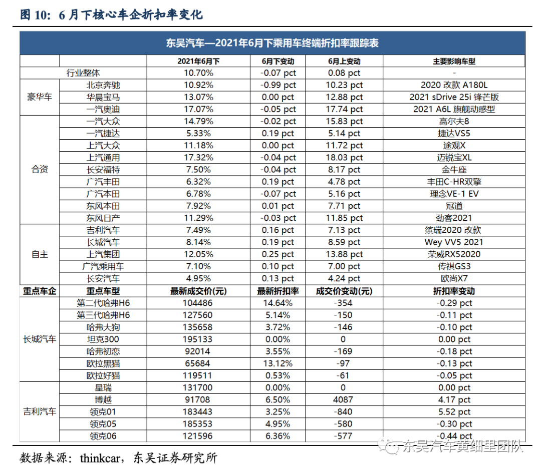 1)剔除新能源的乘用车整体折扣率10.70%,环比6月上-0.07pct,车企6月下折扣率表现分化,上涨幅度较大的是上汽集团(荣威RX52020)+长城汽车(Wey VV5 2021),收紧幅度较大的是北京奔驰(2020 改款 A180L)。