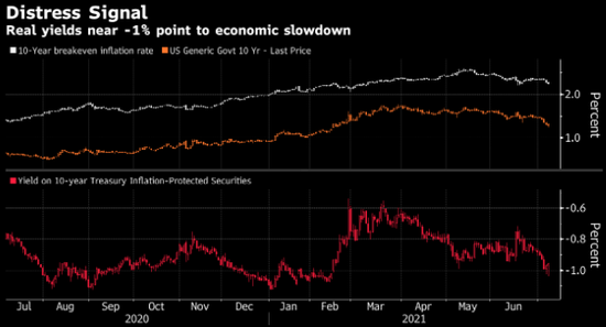 从美国国债市场来看,市场反转的证据非常明显。周四,10年期收益率自2月份以来首次跌破1.25%,而剔除通胀预期的实际收益率进一步深陷负值区域——这是复苏停滞的经典指标。10年期盈亏平衡通胀率(breakeven rates)——市场对未来十年价格预期的预测——下滑至3月份以来的最低水平。