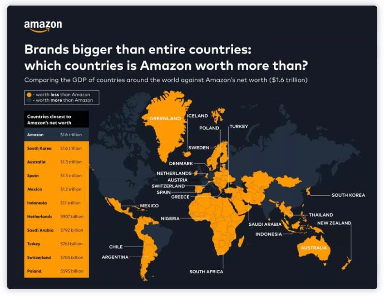 亚马逊的业务丝毫没有收到疫情的影响,并在疫情期间迅速扩张,市值飙升到1.6万亿美元,比全球92%的国家更富有。