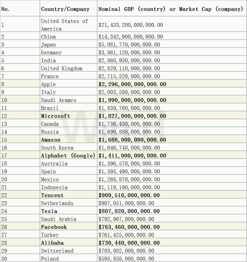 整体而言,9家公司的市值,能够跻身“全球30大经济体榜单”,大多数是大型科技巨头,如苹果、亚马逊、特斯拉(TSLA.US)、谷歌(GOOG.US)、腾讯(00700)和Facebook(FB.US)等。