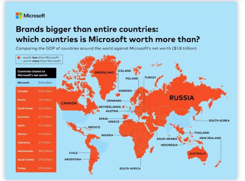 微软的市值与加拿大的GDP持平,比包括澳大利亚、西班牙和印度尼西亚在内的许多发达经济体更富有。事实上,苹果和微软的市值都超过了所有中欧和波罗的海国家的总和!