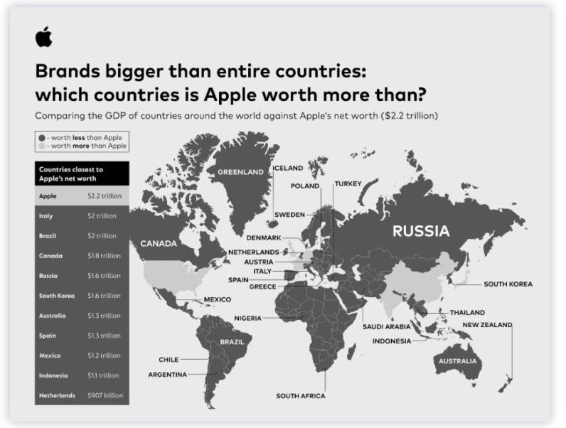 比如全球科技总龙头、市值一哥苹果,其庞大的净资产超过意大利、巴西、加拿大和俄罗斯等国的GDP。事实上,世界上只有7个国家的GDP高于苹果公司市值,意味着这家科技巨头比世界上高达96%的国家更富有。