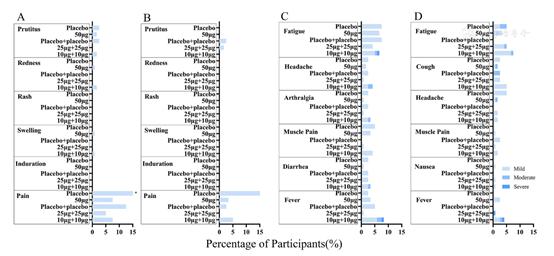 在这项随机、双盲、安慰剂对照的II期试验中,V-01所采取的重组融合蛋白与明矾佐剂联合应用的方案表现同I期试验一致,表现出一如既往的良好安全性特征。疫苗接受者和安慰剂接受者中出现不良事件的参与者百分比相似。在双剂量10ug组中,并未出现因接种V-01所致的任何3级不良事件(发热和疼痛)。