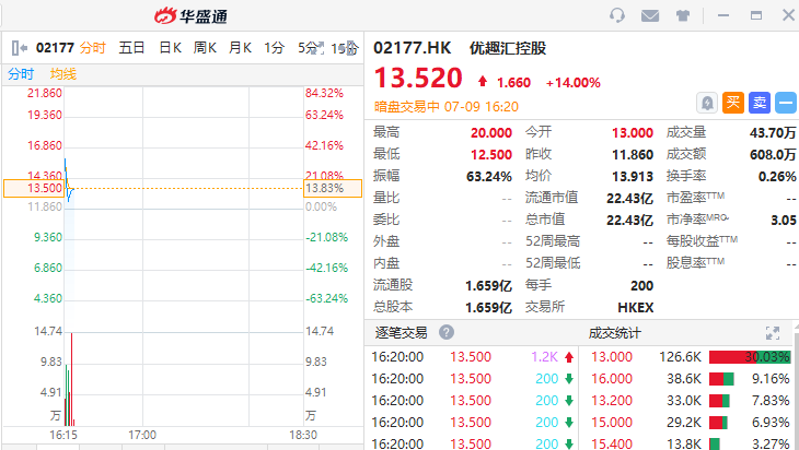 优趣汇大涨超14%,当前成交额600万港币,最新总市值超22亿港币。