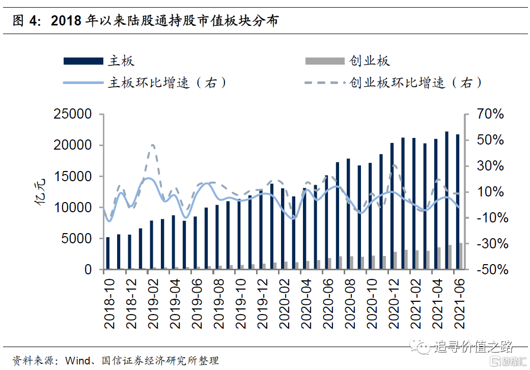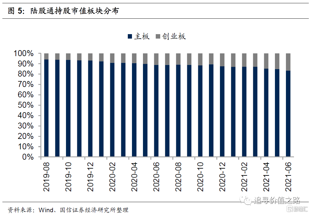 从持股市值的板块分布上看,6月陆股通持股市值在主板有所下降、创业板有所上升,不过相较于5月而言,创业板持股市值的环比增速小幅下滑。具体而言,截至6月30日,主板持股市值为 21743亿元,环比下降2.1%;创业板持股市值 4296亿元,环比上升8.6%。