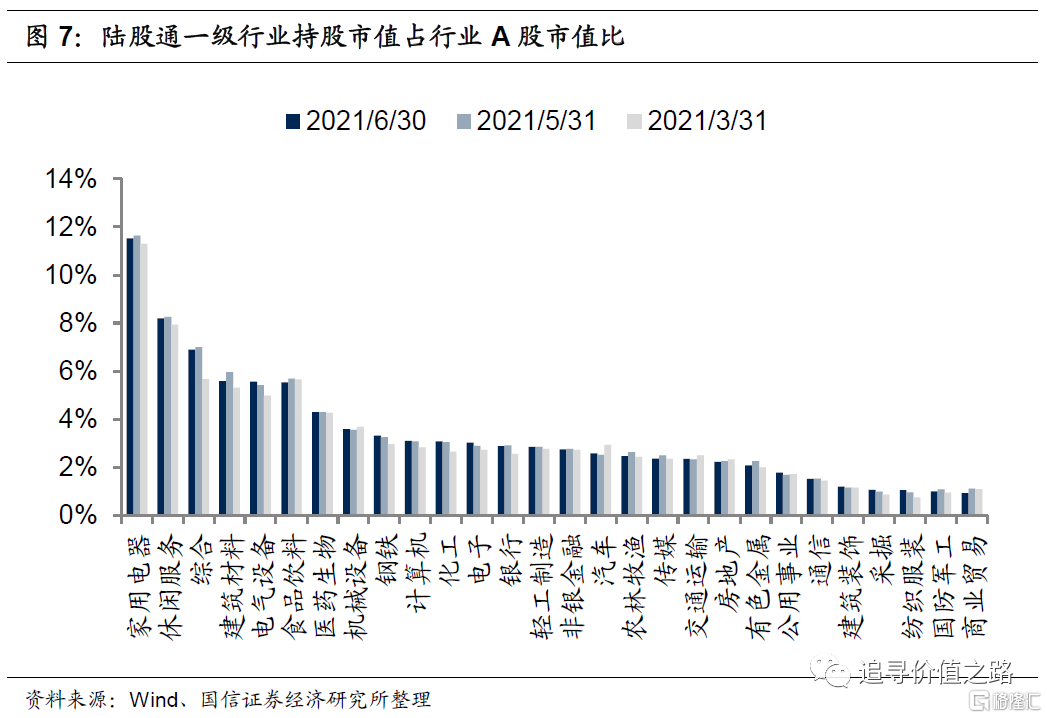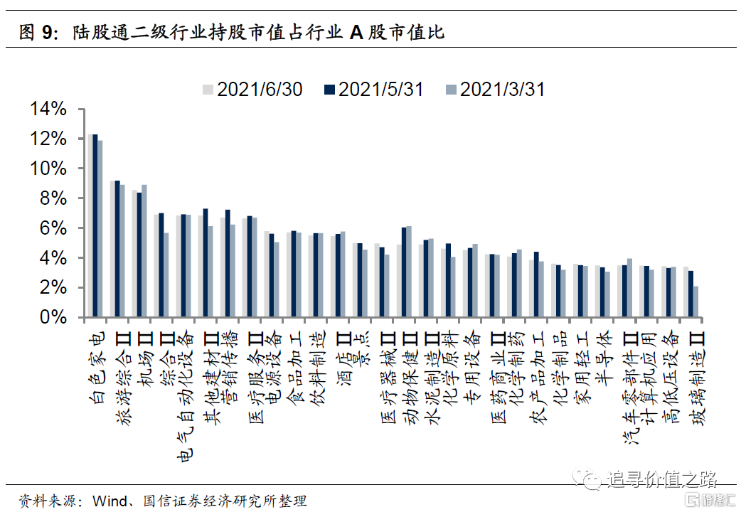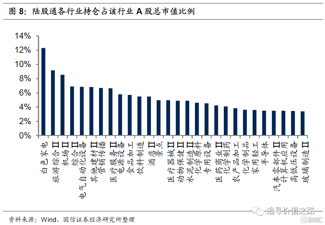 从二级行业来看,白色家电、旅游综合、机场等细分行业中,陆股通持股市值占行业A股总市值比例较高。截至6月30日,二级行业中,陆股通定价权排名前五的分别是白色家电、旅游综合、机场、电气自动化设备和其他建材行业,占比分别为12.3%、9.2%、8.6%、6.8%和6.8%;陆股通定价权排名靠后的五个行业分别是餐饮、农业综合、渔业、其他轻工制造和园林工程。