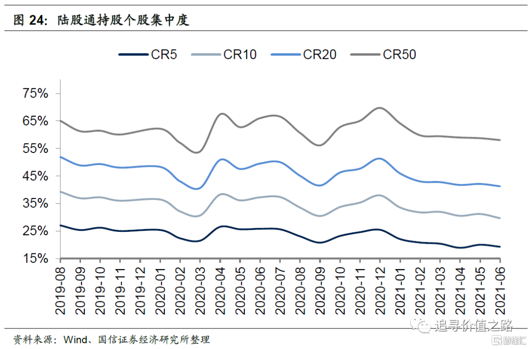 个股集中度方面,6月份陆股通持仓前五、前十、前二十、前五十个股集中度小幅下降。具体来看,6月份个股 CR5、CR10、CR20和CR50分别为19.3%、29.7%、43.3%和58.0%,较上月分别下降了0.7、1.5、0.8、 0.7个百分点。