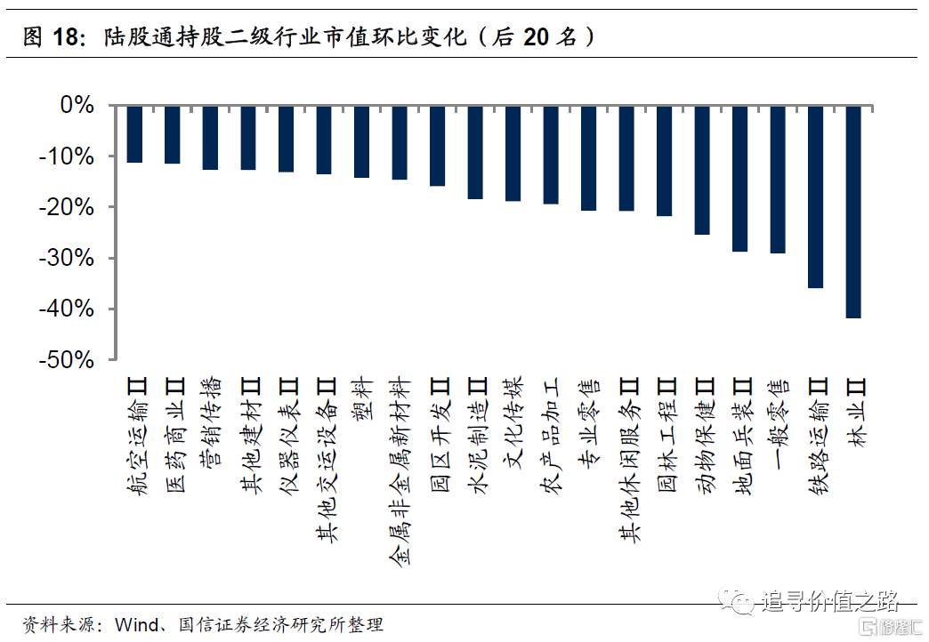 从持股市值的环比变化角度看,6月份申万二级行业中陆股通持股市值环比变化下降居多,其中通信运营、运输设备和金属制品行业持股市值增幅居前。具体看,市值环比增幅最大的前五个行业分别是通信运营、运输设备、金属制品、航运和专业工程行业,环比增幅分别为134%、117%、79%、50%、38%。林业、铁路运输、一般零售、地面兵装和动物保健等行业持股市值环比降幅居前,持股市值环比分别下降42%、36%、29%、29%和25%。