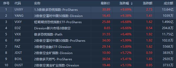 从ETF涨幅榜来看,涨幅居前的ETF集中做多恐慌指数ETF。1.5倍做多恐慌指数ETF大涨9.69%,成交额13.64亿美元;短期期货恐慌指数ETF涨6.68%,成交额1.50亿美元。