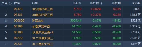 沪深300指数收跌0.37%。其中,华夏沪深三百-R(83188.HK)跌0.50%,成交额达2734万港元;华夏沪深三百ETF(03188.HK)跌0.42%,成交额3.34亿港元。