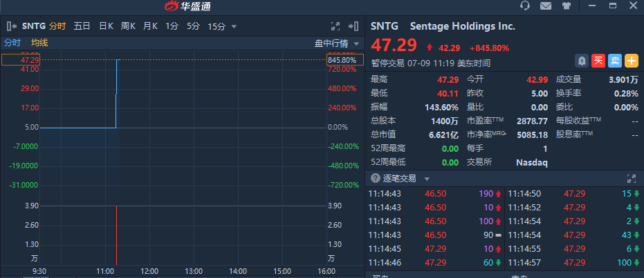 华盛资讯7月9日消息,金融服务提供商叁腾科技Sentage Holdings Inc.(SNTG)正式登陆纳斯达克,首挂高开近846%触发熔断,最新报47.29美元,市值6.62亿美元。