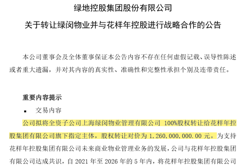 7月6日,绿地发公告称,公司拟将全资子公司:上海绿闵物业管理有限公司(以下简称“绿闵物业”)100%股权转让给花样年下属公司:深圳市富昌商业服务有限公司(以下简称“深圳富昌”),股权转让对价为12.6亿元!同时,自2021年—2026年的5年内,双方将在绿地集团新增商业物业项目中展开物业管理战略合作。