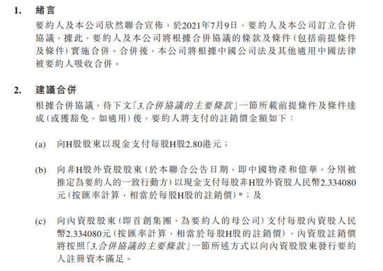 (a)向H股股东以现金支付每股H股2.80港元;(b)向非H股外资股股东(即中国物产和亿华,分别被推定为要约人的一致行动方)以现金支付每股非H股外资股人民币2.334080元(按汇率计算,相当於每股H股的注销价);及(c)向内资股股东(即首创集团)支付每股内资股人民币2.334080元(按汇率计算,相当於每股H股的注销价)。