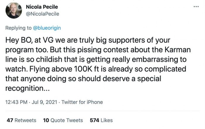 维珍银河公司没有立即回应对蓝色起源公司推文的评论请求。但维珍银河公司的试飞员 Nicola Pecile 进行了反击,他在一条现已删除的推文中说:“这场关于卡曼线的比赛太幼稚了,让人看了很尴尬。在 100K 英尺以上飞行已经非常复杂,任何这样做的人都应该得到特别的认可”。在另一条推文中,他引用了维珍银河公司在2018年的首次载人航天飞行,并补充说蓝色起源 “到目前为止只飞过人体模型”。