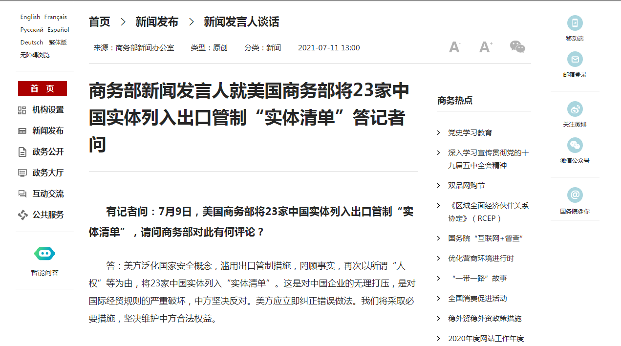 针对美国商务部近日将23家中国实体列入出口管制“实体清单”,商务部新闻发言人11日答记者问表示,美方泛化国家安全概念,滥用出口管制措施,罔顾事实,再次以所谓“人权”等为由,将23家中国实体列入“实体清单”。这是对中国企业的无理打压,是对国际经贸规则的严重破坏,中方坚决反对。美方应立即纠正错误做法。我们将采取必要措施,坚决维护中方合法权益。